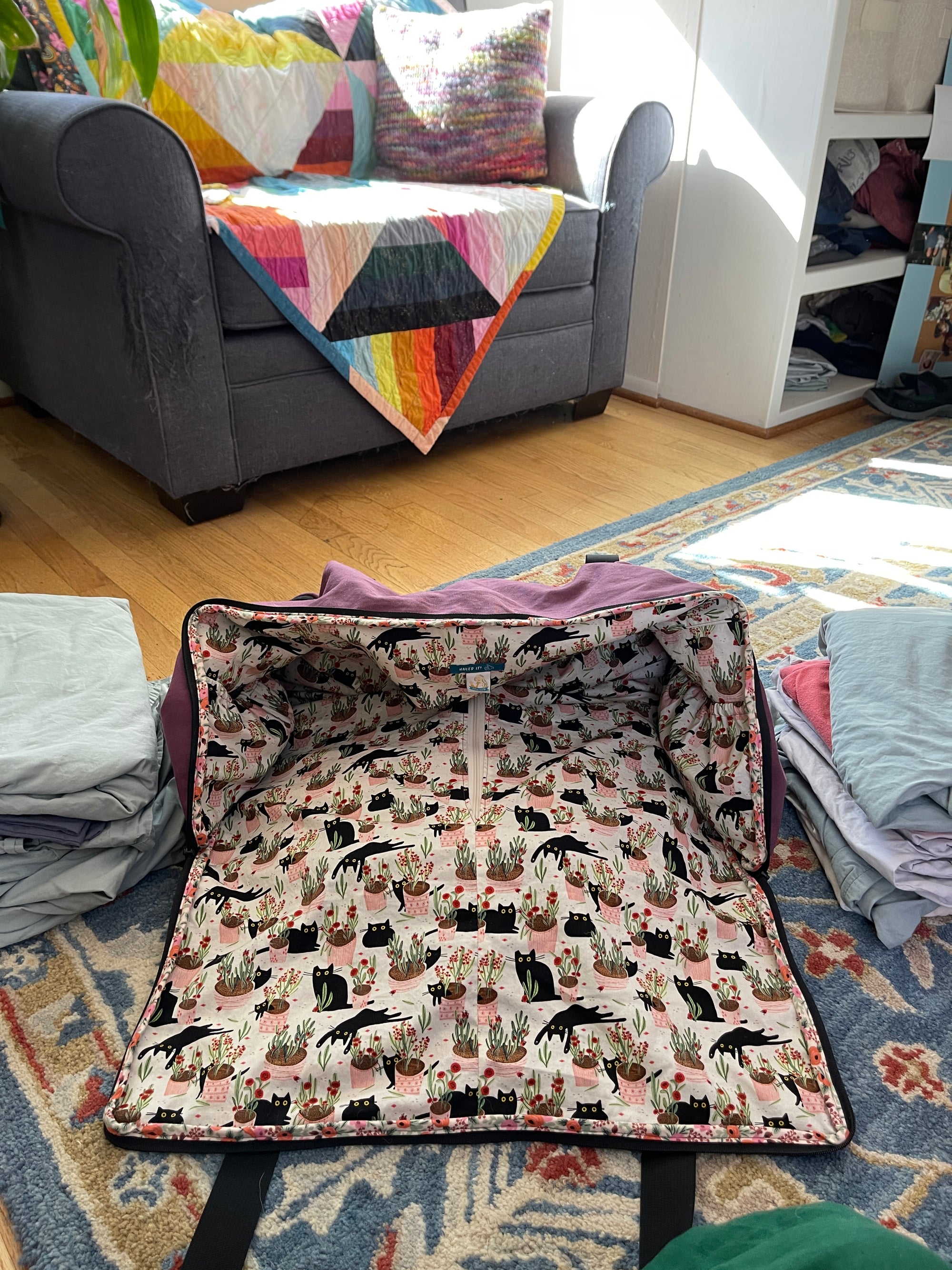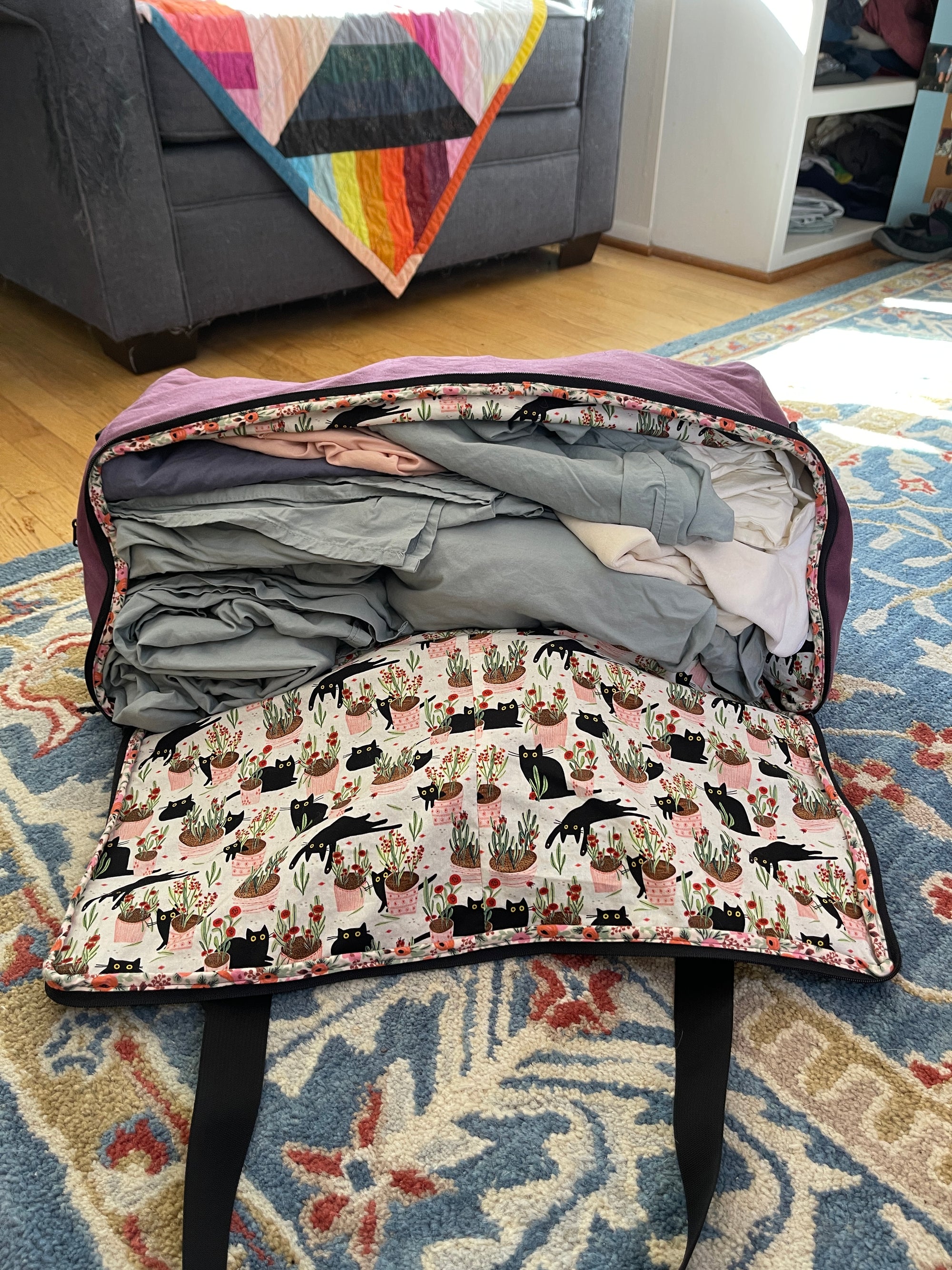 Notes:This was fun project. She has a tutorial on how to sew the bag as it's designed. I wanted the challenge of using fewer zippers and to see if I could make it one zipper- and I did! But you don't have to do that. It's gigantic! I'm not even sure I'll be able to use it, it's so large. But I love the idea of holding both hangers and other stuff.