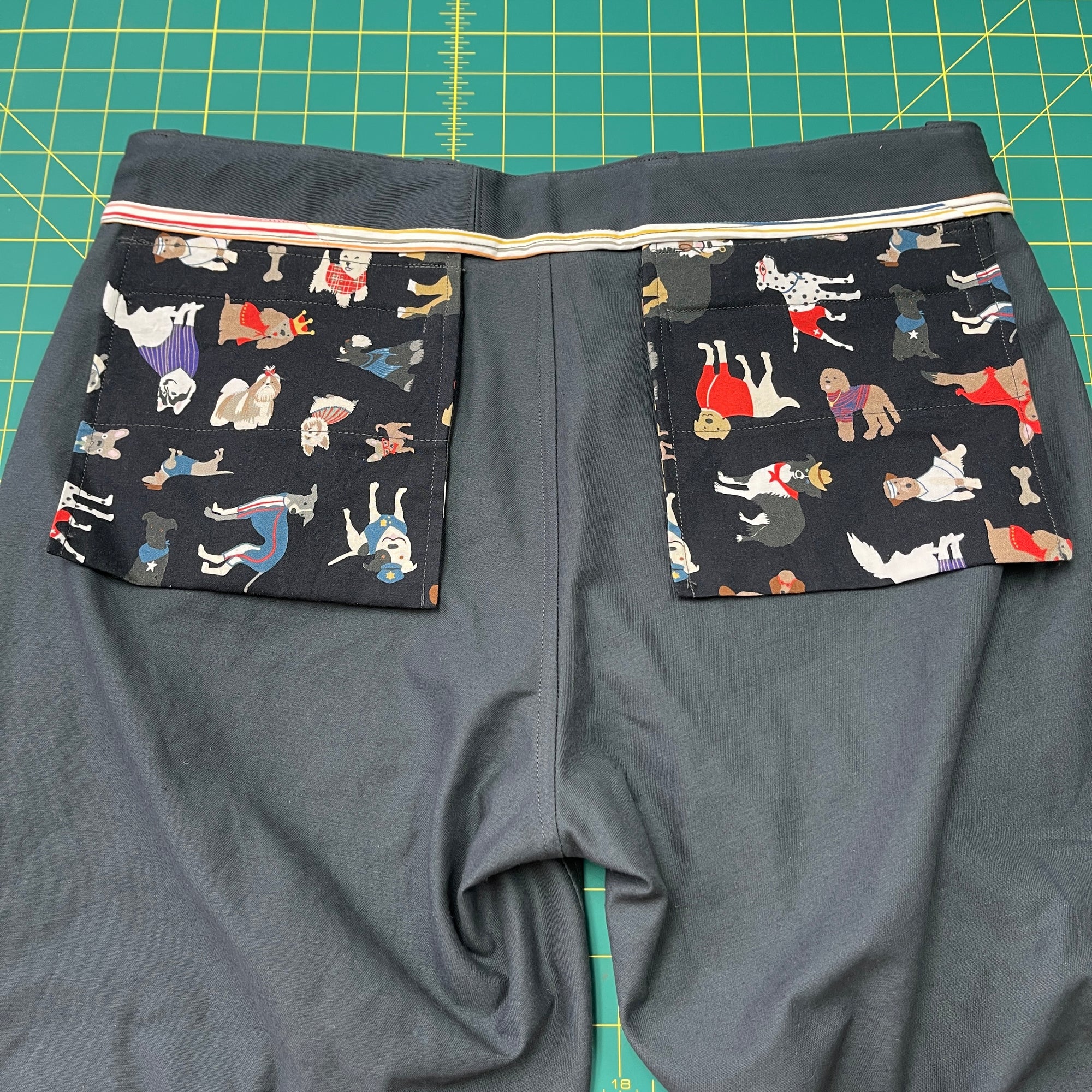 I also made these as pants here- they are the slate pair in the photos with the dog pocket lining: