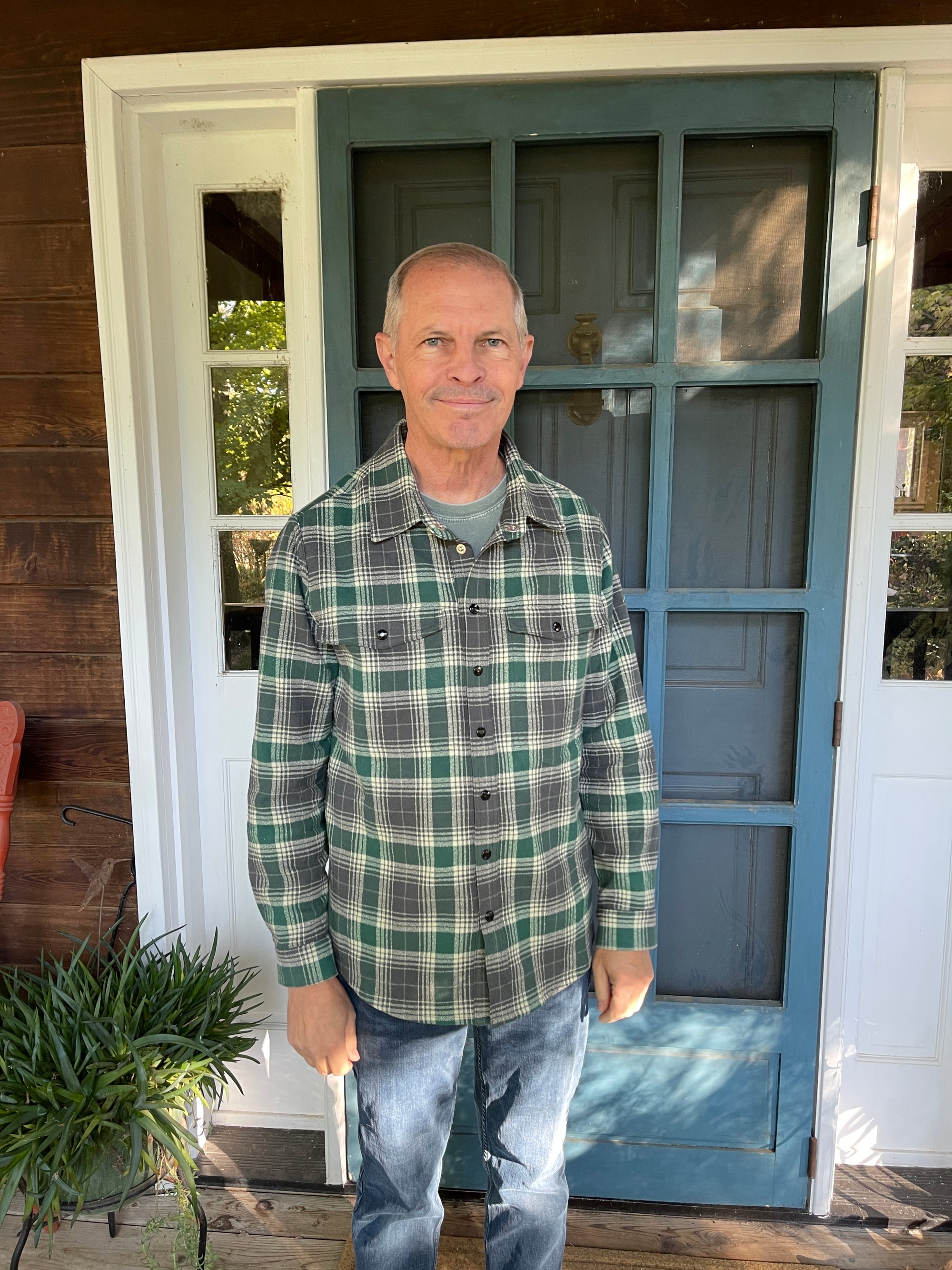 Description: Men's button-up shirt with shaped back fit, front drop-in pocket with flaps, and collar and collar stand.